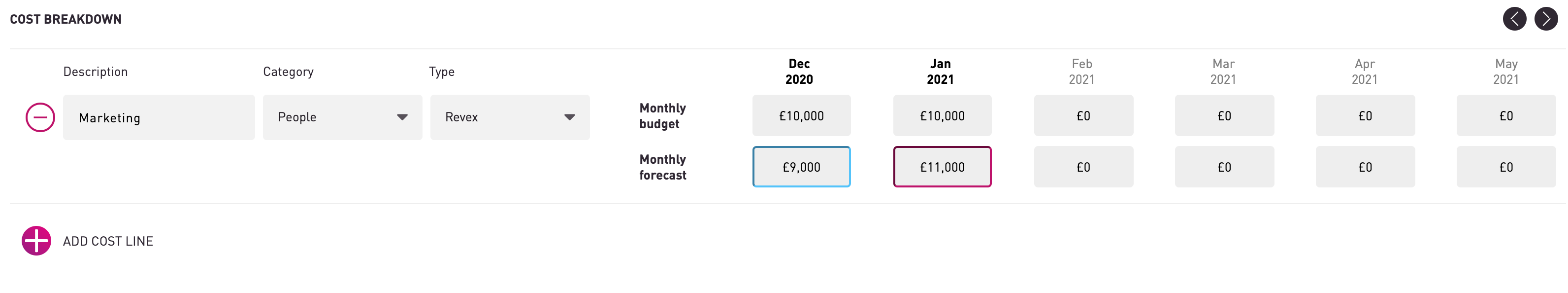 Once added, you can start to breakdown your costs for each month. You can enter a description, category, and type, then your monthly budget and forecast for the relevant month.